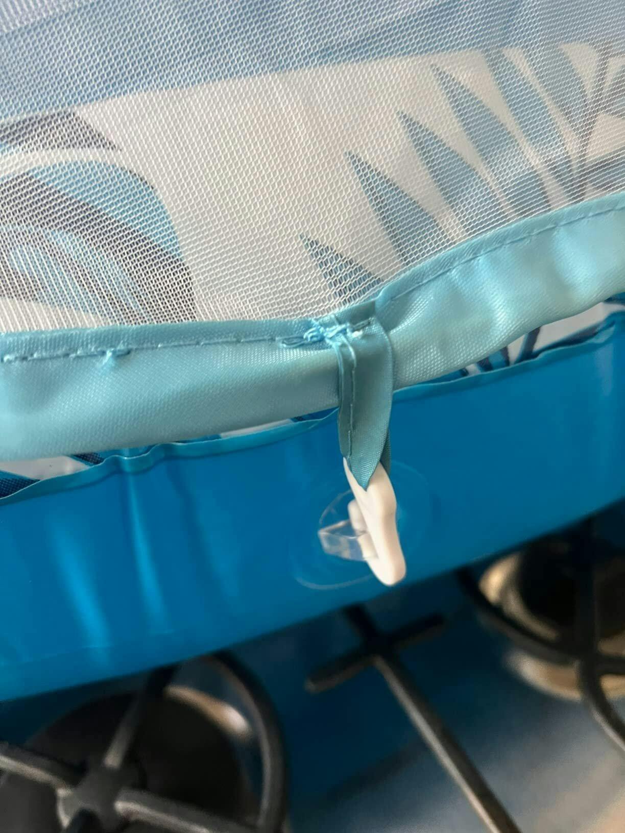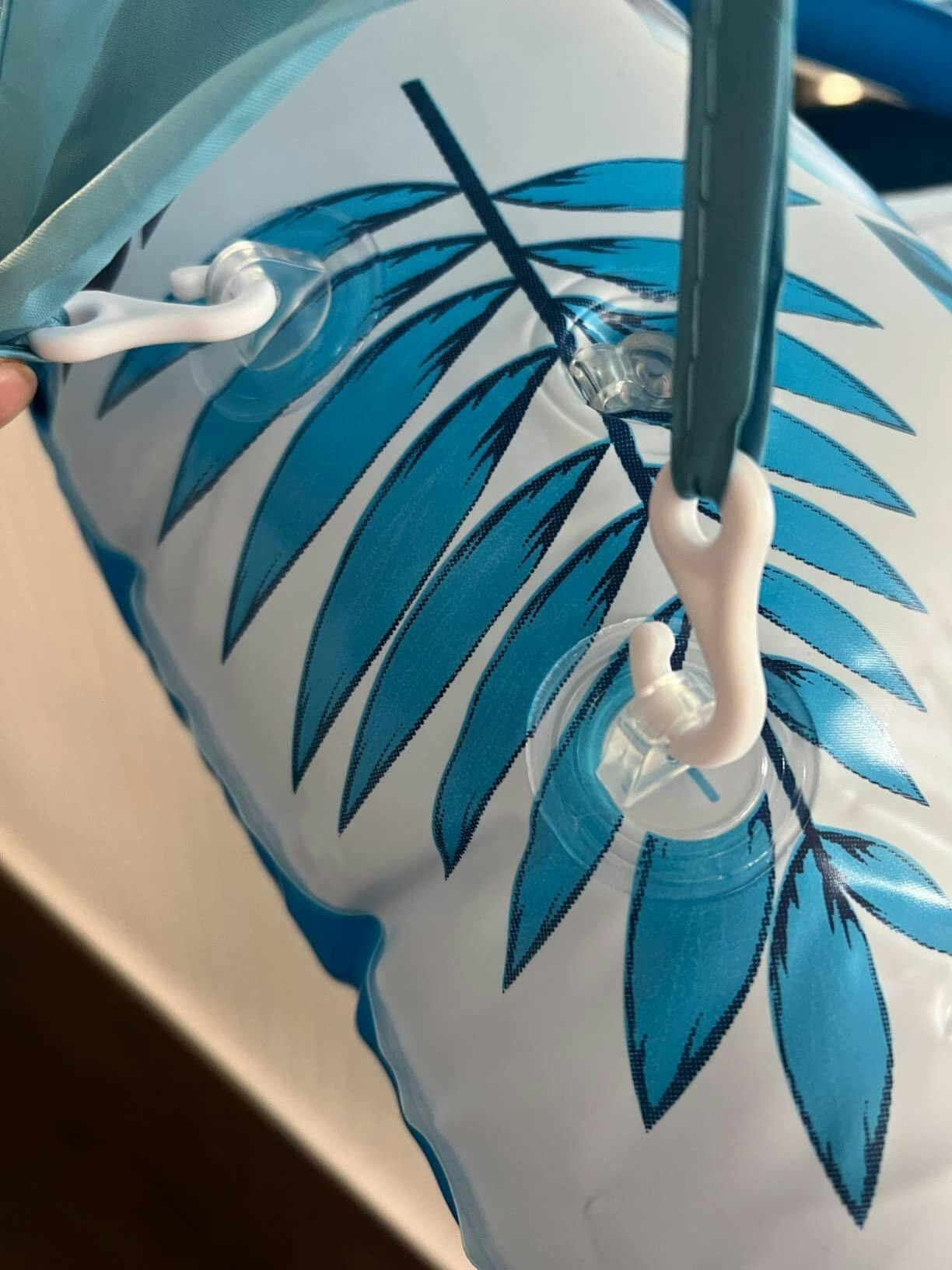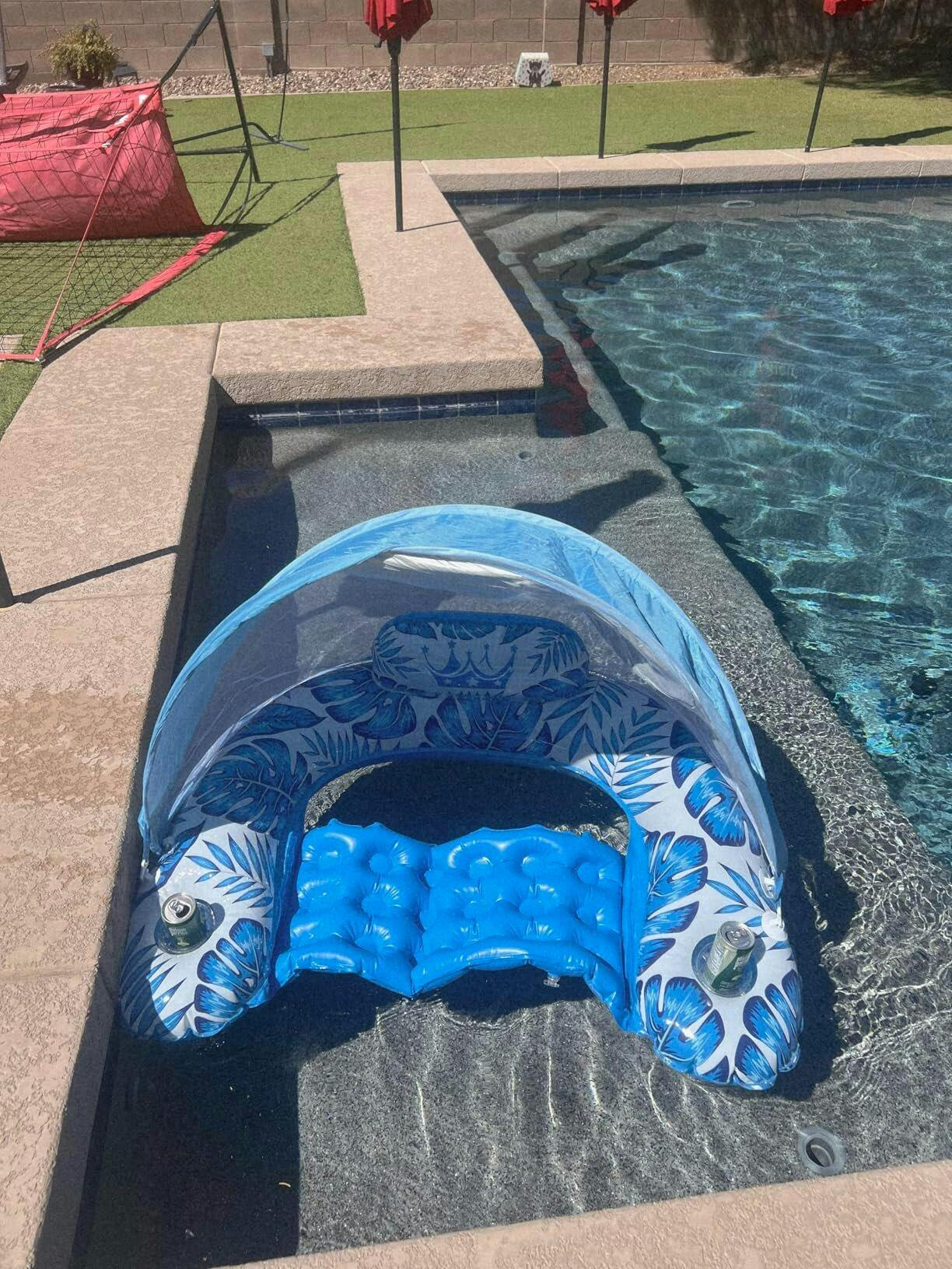 A few very nice features of this pool floaty are that it has dual cup holders, a foldable Bimini top to keep the sun off of your face and shoulders, and also a nice screen in the back of the unit it allows the breeze or air to flow-through to keep things cool. The unit was well packaged and easy to inflate with small blower that we have. It has been in the pool now for several days with several people using it and everyone seems to be very complimentary of the pool floaty.