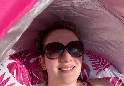 I worry about sun on my face and neck, so I find this float perfect. I don’t have a picture from afar of me in it, but it is super comfortable with and without the shade. The shade also folds down so it can be easily stored. The color is pretty, and it was easy to inflate. The size fits my full tall figure as well, which is fabulous.